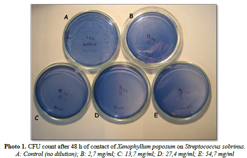 In Photo 1 we observe the CFU of S. sobrinus in box A (control). In the following boxes, no more CFU of S. sobrinus are observed after 48 h of incubation.