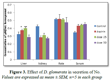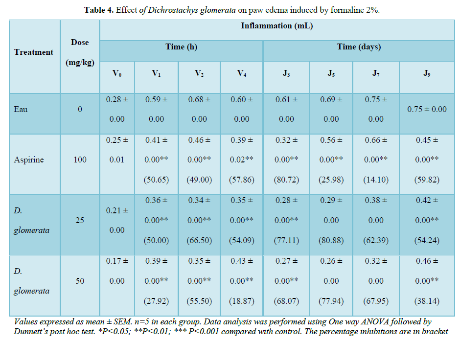 The abdominal constriction response induced by acetic acid is a sensitive procedure to evaluate peripherally acting analgesics [6]. In general, acetic acid causes pain by liberating endogenous substances such as serotonin histamine, prostaglandins (PGs), bradykinins and substance P, endings. Local peritoneal receptors are postulated to be involved in the abdominal constrictions response [5]. The method has also been associated with prostanoids in general that is, increased levels of PGE2 and PGF2α in peritoneal fluids as well as lipoxygenase products [7]. The significant increase in pain threshold produced by tests and standard in these models suggests involvement of central pain pathways. Pain is centrally modulated via a number of complex processes including opiate, dopaminergic descending noradrenergic and serotonergic systems [8,9]. The analgesic effect produced by the tests and standards may be via central mechanisms involving these receptor systems or via peripheral mechanisms involved in the inhibition of prostaglandins, leukotrienes and other endogenous substances that are key players in pain. The selective cox-2 inhibitor has high effective than the conventional NSAIDs and has low GI and high cardiovascular side effects than to the conventional NSAIDs. But the chances of side effects of combination products are more as compare to the single drug. More study on combination drug therapy may overcome. Inflammatory disease is one of the major health problems worldwide. Inflammation is the body defense mechanism. Sub-chronic inflammation is a reaction arising when the acute response is insufficient to eliminate pro-inflammation agents. Sub-chronic inflammation includes a proliferation of fibroblast and infiltration of exudation. Treatment of carrageenan induced-granuloma with extract at the doses of 25, 50, 100 and 200 mg/kg as well as indomethacine significantly reduced the volume of exudative fluid as compared to group 1 (control) and decreased the number of polymorphonoclear leukocytes indicating its effectiveness against development of proliferate cells and infiltration of leukocytes [10]. It is well known that inhibition of edema induced by formaldehyde in rats is one of the best suitable test procedures for chronic anti-inflammatory agents as it closely resembles human inflammation [11]. Extract and reference drug significantly inhibited the inflammation on the 10th day. These results suggested that the plant extract might possess anti-proliferative and/or anti-inflammatory activities. Dimo et al. [12] obtained the similar result with the leaf extracts of Kalanchoe crenata Andr. They suggested that plant might act on proliferative phase of inflammation. D. glomerata reduce the secretion of cytokines and oxygen reactive specie and had anti-inflammatory activity and articular cartilage destruction repair, this is deemed to be the most effective agent for this purpose. Dichrostachys glomerata is not toxic and this plant is recommended to treatment of anti-inflammatory and pain diseases [2,13-15] (Figures 1-3 and Tables 1-4).