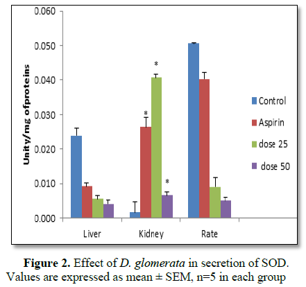 Rats were divided into 4 groups (n=6 per group): control group, formaline 2% (0.1 mL) only treated group (negative control), aspirin (100 mg/kg at 1st day, 1 mg/kg at 1 h) as a positive control, sample groups D. glomerata extracts (25 and 50 mg/kg) daily treated orally, over 9 days. Paw size was measured 1, 2, 4 h and thereafter every day.