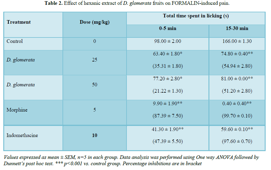 The procedure described by Atsang et al. [2] was used but with slight modifications. Briefly, pain was induced by subcutaneous injection of 20 μl of formalin 2.5% in into the plantar surface of the right hind paw, using a 30 gauge needle. Rats (five per group) were pre-treated with the aqueous extracts of D. glomerata fruits (25 and 50 mg/kg, p.o.), indomethacin (10 mg/kg), morphine In the present study, the tests used to assess the analgesic effect of the tested compounds are based on nocifensive behavior of mice from heat applied in both hot plate and tail flick tests. Those tests have some disadvantages, since the latency may be altered by factors unrelated to nociceptor responsiveness, such as basal skin temperature. Although this is true, this factor was eliminated by taking the baseline of each mouse before the experiment and those not within the range were excluded from the experiment. In addition, it was noted that the results were better at 30 min, since those tests are prone to habituation. There was a reduction in response with repetitive stimulation [2].