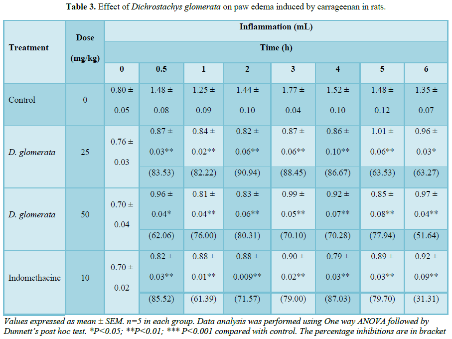 The present study demonstrated that the hexanic extract of D. glomerata possess anti-inflammatory activity and central analgesic activity due to the present of compounds like flavonoids [16]. These findings may scientifically justify the use of Dichrostachys glomerata for the treatment of pain and inflammation and shows that the plant can be source of new drug [17,18].
