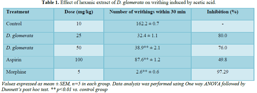 The animals were randomly divided into 4 groups (n=5). Group 1 was given distilled water (10 ml/kg) by oral route. The extracts of D. glomerata fruits (25 and 50 mg/kg; p.o.) and distilled water were administered 1 h before the nociceptive agent. Morphine (5 mg/kg; i.p.) and aspirin (100 mg/kg, i.p.) was used as standards and administered 15 min before chemically induced hyperalgesia [2]. The animals were then placed individually in a glass jar. 10 min after acetic acid administration, the number of writhes (stretching of the abdomen with simultaneous stretching of at least one hind limb) was observed for a period of 30 min.