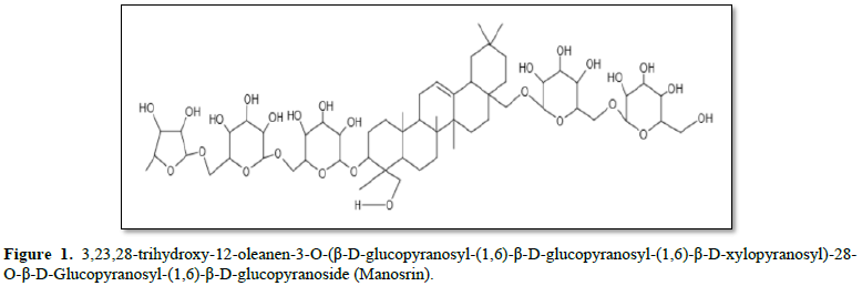 The crude extract of A. mannii was reported to be non-toxic to diabetic animal models; it showed anti-inflammatory, analgesic, anti-cholesterolemic and antibacterial properties [19]. These attributes fit a plausible candidate for scrutiny as source of a good Diabetes mellitus drug. The isolation of Manosrin (3,23,28-Trihydroxy-12-oleanen-3-O-(β-D-glucopyranosyl-(1,6)-β-D-glucopyranosyl-(1,6)-β-D-xylopyranosyl)-28-O-β-D-glucopyranosyl-(1,6)-β-D-glucopyranoside) [20] chatted a new course for Diabetes mellitus treatment, after 1,7-naphthyridine alkaloid (anisopusine), 5-α-hydroxy-lup-20(29)-en-3-β-yl-eicosanoate, (6)-gingerdione, (6)-dehydrogingerdione and ferulic acid [21] were isolated from same. Manosrin, a Triterpene Saponin, previous studies showed that, it suppresses cholesterol absorption [22], inhibit the action of enzymes responsible for the synthesis of cholesterol [23], modulate mammalian immune system [24], improve anti-inflammatory and blood circulation [25], anti-carcinogenic [26], hyperlipidemic [15], hyperglycemic [27] and inhibits intestinal α-amylase [28] among others. The strong wound healing and other properties [29] attributed to these compounds is linked to the 3-O-glucoronide moiety and the 28-carbonyl group of the oleanolic acid glucoside. The said oleanic acid constitutes the core of new compound, manosrin (Figure 1).