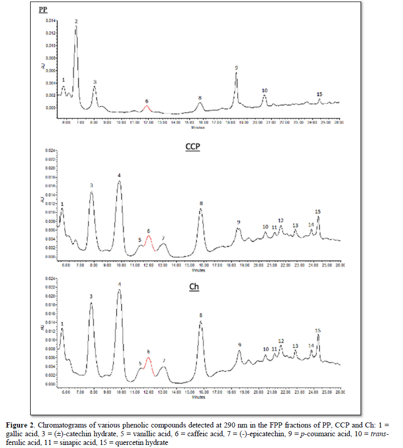 Using a mobile phase of methanol and acetic acid, two flavanol compounds (catechin, epicatechin), one flavonol (quercetin) and six phenolic acids (gallic acid, p-coumaric acid, ferulic acid, sinapic acid, vanillic acid, caffeic acid) were identified in the three samples (PP, Ch, & CCP). A total of nine polyphenol standards were applied (Figure 1). The wavelength used to detect (±)-catechin hydrate, (-)-epicatechin and sinapic acid was 280 nm, while 290 nm was applied with gallic acid, vanillic acid, caffeic acid, p-coumaric acid, trans-ferulic acid and quercetin hydrate. The chromatograms obtained for free polyphenol fractions (FPP) in PP, CCP and Ch are shown in Figure 2. Epicatechin, vanillic acid and sinapic acid were not detected in PP (Figure 2). However, Ch had significantly (P<0.05) greater amounts of epicatechin, vanillic acid, sinapic acid, gallic acid, catechin, caffeic acid and quercetin than CCP. Similarly, CCP showed the similar pattern with significantly (P<0.05) greater amounts of gallic acid, catechin, caffeic acid and quercetin than PP. p-coumaric acid concentrations in CCP (13.37 µg/g DW) and Ch (12.93 µg/g DWwere similar (P>0.05), and at the same time significantly (P<0.05) greater than that in PP (8.22 µg/g DW. Ferulic acid was the only polyphenol in PP with significantly (P<0.05) greater concentration compared with CCP and Ch (Table 2).