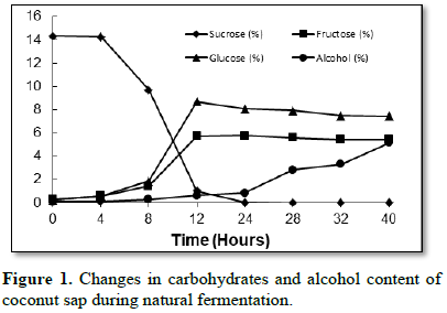 The major physical, chemical and microbiological changes occurring in the fermenting sap indicated that a natural fermentation of coconut sap consist of an initial lactic acid fermentation, a middle alcoholic fermentation and a final acetic acid fermentation. It also appeared that activities brought about by micro-organisms of early phase helped the activities of the micro-organisms in each of the later phases [3].