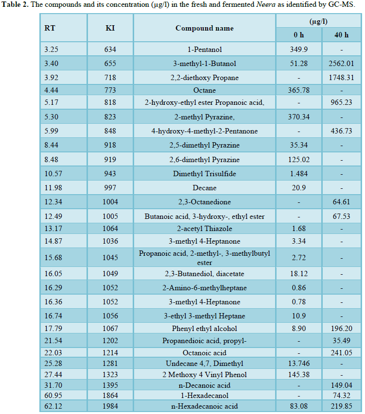 Neera is a highly nutritive and a good digestive agent, however its highly fermentable nature makes difficulties in large scale production and storage. The present experimental study is focused on investigating the development of alcohol and volatiles in the Neera over a period of 40 h. The hygienically collected fresh Neera was stored at different time intervals and changes occurring in terms of the physico-chemical parameters, microbiological quality and volatiles development was analysed. The development of alcohol in the Neera samples stored at different time intervals were evaluated using dichromate-oxidation method. The alcohol content recorded maximum of 5.17% in the 40th hour of storage when comparing with the 0.013% alcohol at 0th hour. Microbiological analysis showed high amount of microbial load (total plate count and yeast and mold count) in the Neera samples. Simultaneous distillation and solvent extraction technique was adopted for the extraction of volatiles form Neera. Thus, recovered volatiles were further subjected to GC-MS analysis and major compounds were identified. Many heterocycles are found to present, which could be characteristic of fresh Neera of this region. However, all heterocycles are degraded during the course of fermentation and not observed in fermented (40 h) sample.