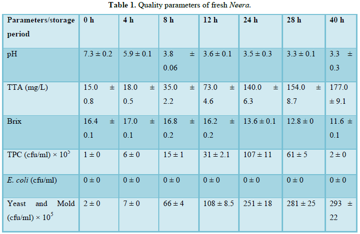 Quality analysis of fresh Neera: Fresh Neera was kept in room temperature (27 ± 5°C) in PET bottles. Stored Samples were analyzed for different quality parameters different intervals namely 0, 4, 8, 12, 24, 28 and 40 h. The parameters include pH, titrable acidity (TTA), Brix, carbohydrate concentration, TPC, E. coli count as well as yeast and mold count.