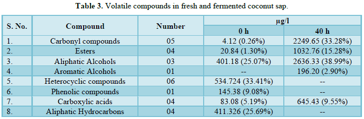 Many researchers studied the volatile components of fresh and fermented Neera and their composition. Atputharajah et al. [3] studied the distribution of microorganisms during fermentation of coconut sap and isolated 166 yeast species and 17 bacterial species. However, reports on the changes of quality profile and flavour components profile of coconut sap during the course of natural fermentation are scanty. Hence, this paper is aimed to evaluate the changes in volatile components along with physico-chemical and microbial parameters of fresh coconut sap during natural fermentation.