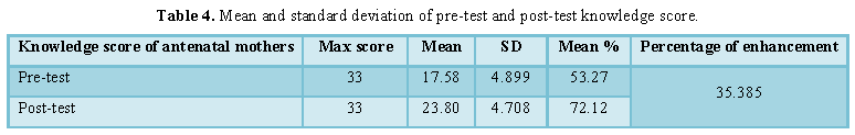 In the pre-test the mean value was 17.58 with a standard deviation of 4.899.The present study found that, the post-test
