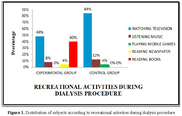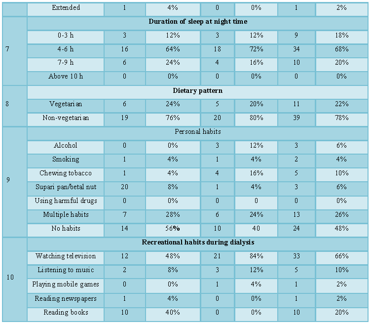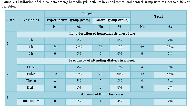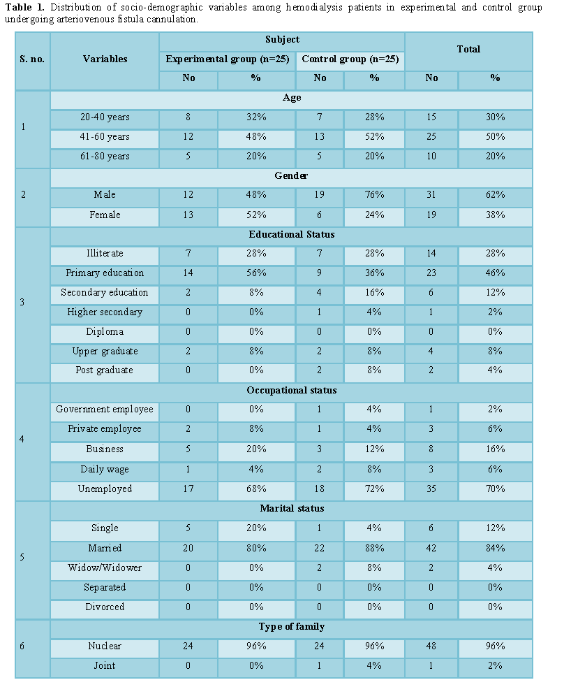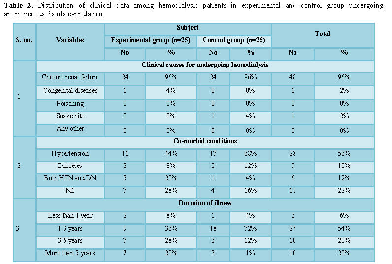 About 13 (52%) subjects belong to the age group of 41-60 years. Most of the subjects 19 (76%) were males [7-10]. About 14 (56%) subjects studied up to primary education. Most of the 18 (72%) subjects were unemployed [11-16]. Majority of subjects 24 (96%) were known case of chronic renal failure. Majority 21 (84%) of the subjects having arteriovenous fistula in their left arm. Nearly half of the subjects 14 (56%) had brachio-cephalic site of arteriovenous fistula. For all of subjects 25 (100%), attending duration of hemodialysis is 4 h. Chi-square test was used to assess the post-test score of pain in experimental and control group with socio demographic variables [12-14]. It was concluded that age, gender, educational status, occupational status, marital status, type of family, duration of sleep at night time, dietary pattern, personal habits and recreational activities during dialysis procedure were non-significant at 0% level. Chi-square test was used to assess the post-test score of pain in experimental and control group with selected clinical data. It was concluded that co-morbid conditions, period of hemodialysis in months, presence of arteriovenous fistula in an arm, site of arteriovenous fistula, duration of present arteriovenous fistula site use, frequency of attending dialysis in a week, number of dialysis per month, patients weight in kilograms, techniques of arteriovenous cannulation, size of arteriovenous cannula used were non-significant at P ≤ 0.05 level.