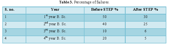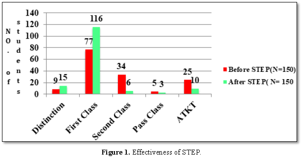 1. The STEP program was found to be effective. The STEP program reduced the number of failures in the final exams (Table 3). STEP implementation increased the number of distinctions and first class among the students (Figure 1).