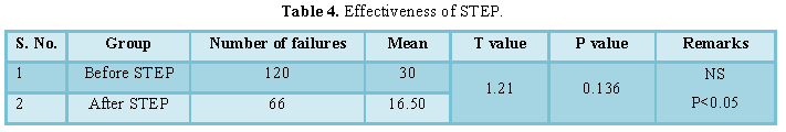 Table 5 indicates that p value of 0.136 is less than 0.05 and hence, H0 is rejected. Thus, H1 is accepted and indicates that STEP implementation was effective in reducing the number of failures.