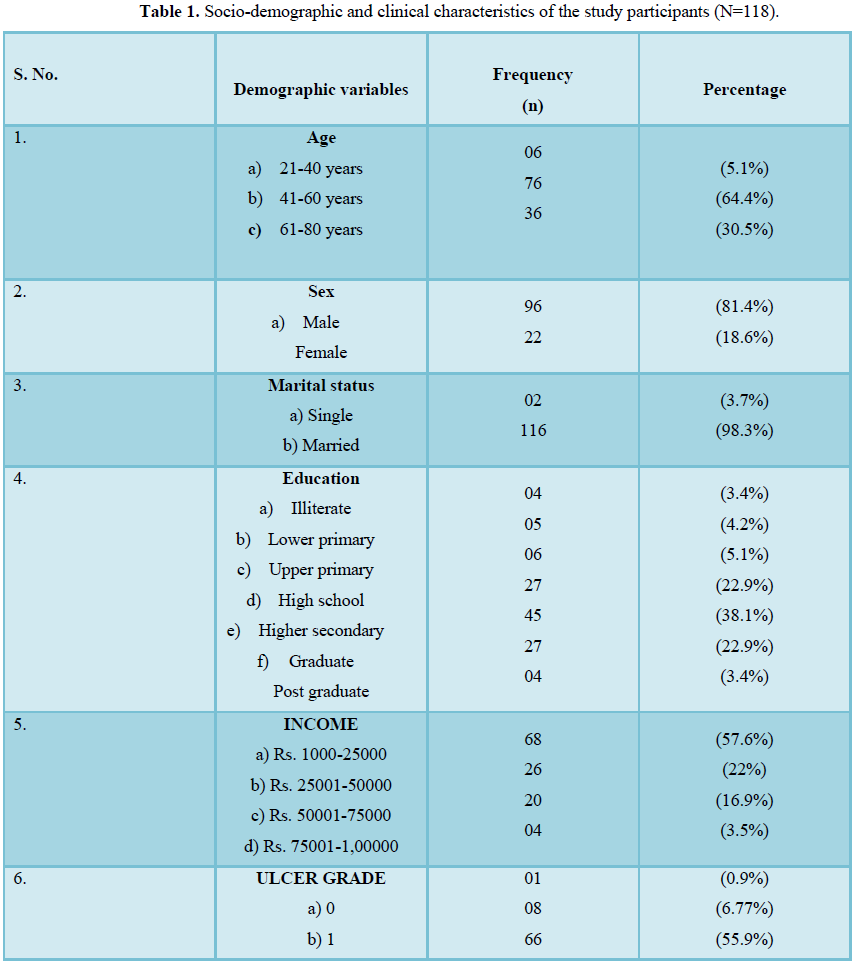 A total of 118 participants aged between 23 years and 80 years with a mean age (SD) of 55.22 (11.24) were included in the study. The sociodemographic and clinical characteristics of the study participants are presented in the below given (Table 1).