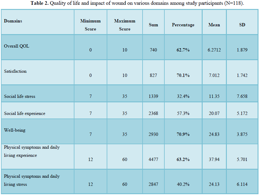 Successful healing of DFUs often require long periods of treatment with additional limitations in patients’ daily activities. This burden in the life of patients adversely affects health-related quality of life [8] and wellbeing which encompasses psychological, physical, spiritual, and cultural domains [9]. The psychological impact of living with a chronic wound is suggested to be of equal importance to and interrelated with the physical symptoms [8,10]. Recent US and UK studies showed that diabetic foot ulcers adversely affect the quality of life of patients [11,12]. The present study found that among diabetic foot ulcer patients, female diabetic foot ulcer patients had a mean QOL score of 6 while males had a mean score of 6.3. Present study revealed a significant correlation (positive) between satisfaction and quality of life at p value