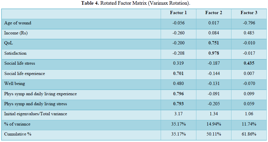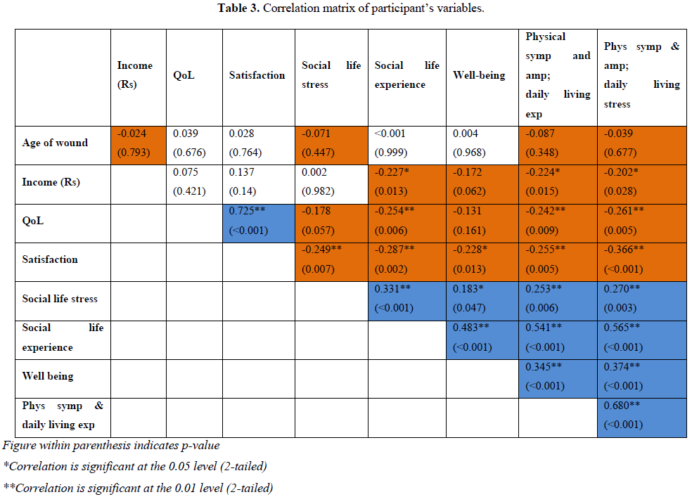 Correlation analysis was to done to study the possible relationship between age of wound, income with QOL, satisfaction and other experiences of daily living as shown in Table 3.