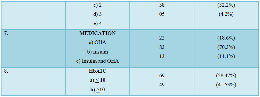 Though our study did not specifically focus on older population, literature shows that diabetic foot ulcers increase with age. Among the participants , majority were males (n=96) while females were (n=22) which indicates foot ulcers are more common in males contributing to the fact that males are more involved in outdoor activities when compared to females, resulting in injury to the foot. More than two thirds of the participants (n=83) were on insulin therapy indicating that patients had poor metabolic control and about half of participants(n=69) had ≥ 10% (HbA1c).