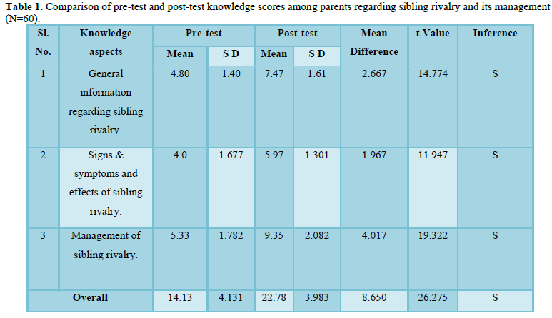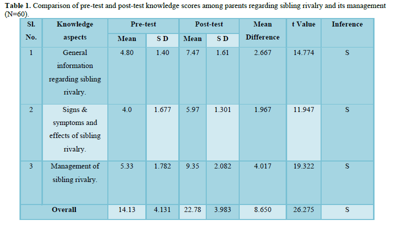 2. Structured teaching programme could be an effective teaching tool in improving the knowledge regarding sibling rivalry and its management among parents.