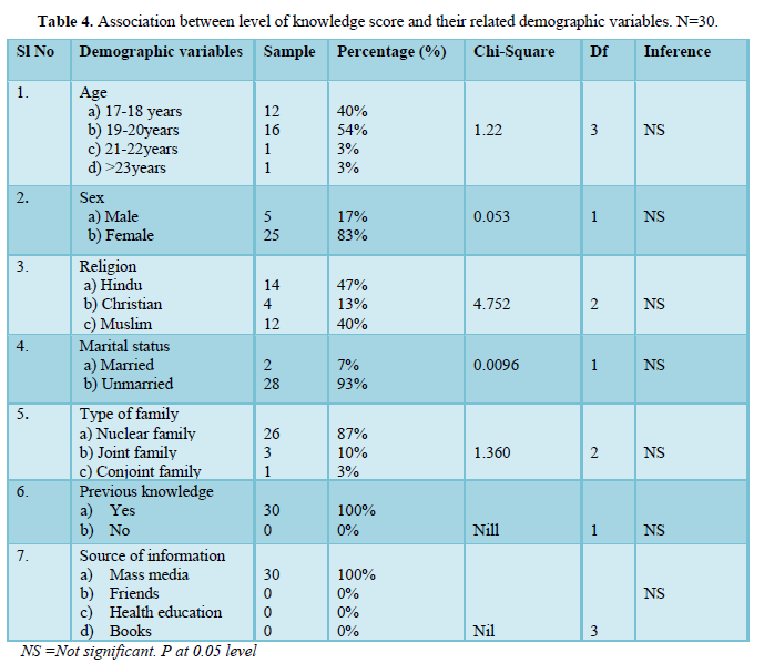 Table 4 shows the association of level of knowledge score with selected demographic variables. It is evident from this table, that there is no significant association with the variables like age, sex, religion, marital status, type of family previous knowledge, source of information on NIPAH virus.
