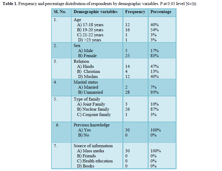 Table 1 indicates the distribution of respondents by age where majority 16 (54%) belongs to the age group of 19-20 years, 12 (40%) were in 17-18 years,1 (3%) were in 21-22 years and 1 (3%) were in >23 years. Majority of the BPT students 25 (83%) were females and 5 (17%) were males. Majority of BPT students 14 (47%) of BPT students were Hindu, 12 (40%) were Muslim and 4 (13%) were Christians. Majority of the BPT students 28(93%) were unmarried and 2 (7%) were married. Majority of the BPT students 26 (87%) were belongs to nuclear family, 3 (10%) were in joint family and 1 (3%) belongs to conjoint family. Majority of the BPT students 30 (100%) had previous knowledge on NIPHA Virus. Majority of the BPT students 30(100%) had source of information through mass media.