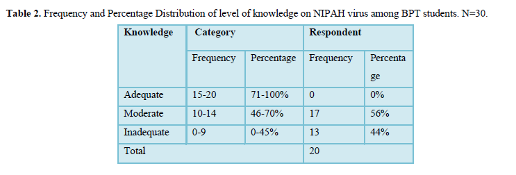 Table 2 represents frequency and percentage distribution of respondents on knowledge level; in which majority 17(56%) of respondent had moderate knowledge, 13(44%) of respondent had inadequate knowledge level regarding NIPAH virus among BPT students, none of them having adequate knowledge.