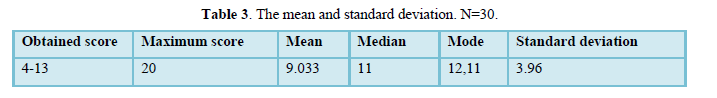 Table 3 represents the mean, standard deviation. The mean is 9.033 with standard deviation 3.96
