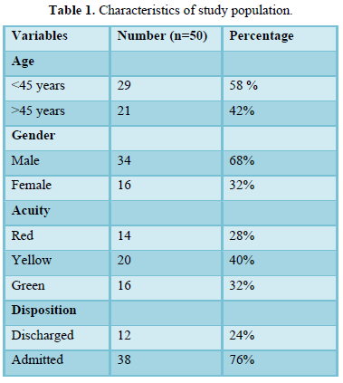 We divided them into two age groups above and below the 45 years of age for easy evaluation of the study. In our study there are 29 patients below age of 45 years and 21 patients were above age of 45 years. Patients attending to emergency department when triaged majority of them fall into yellow category followed by green and red, this implies immediate resuscitate measures should be undertaken in the triage system to save the lives of patients and this is also implication for need of effective staff in the triage with good training, these findings were correlated with a study conducted [6].