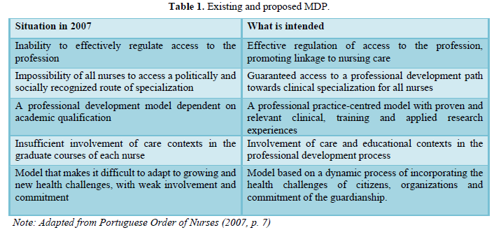 MDP, over some years was developed under the supervision of OE Board of Nursing Law No. 111/2009 of 16 September 2009 amended OE Statute in its article 7, which sets up a new Skills Certification System. The system includes a period of Tutored Professional Exercise (EPT) for the Nurse title. For the registration title Specialist Nurse is considered a process of competences certification in a specific clinical area, which takes place under equal conditions in periods of tutelage practice, called Tutored Professional Development (DPT), respectively No. 2 and No. 4 of art. 7 of Law No. 111/2009, of September 16, 2009 [6].