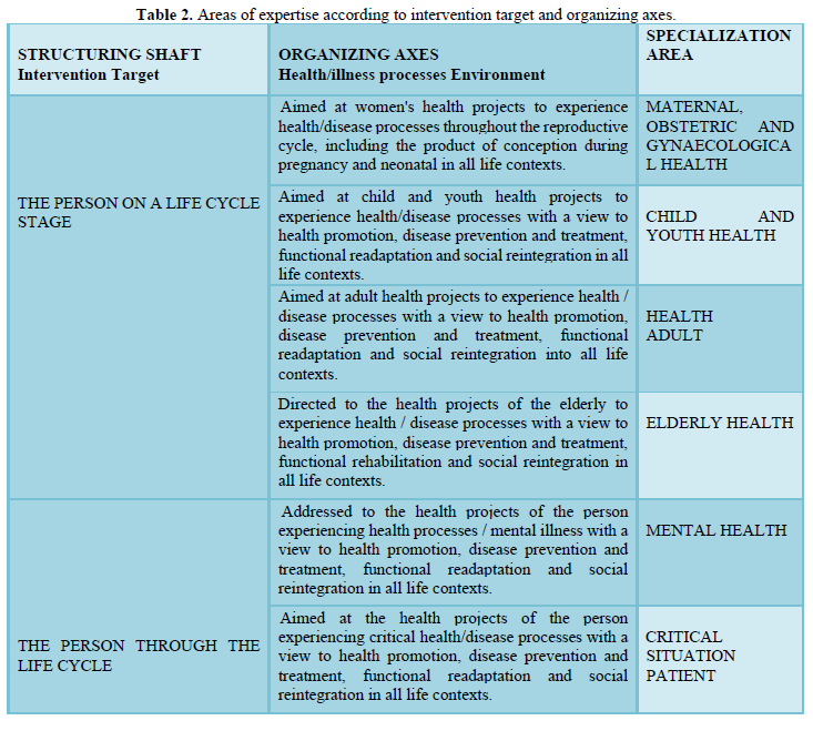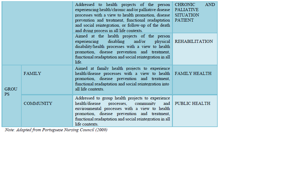 The second pillar, SIECE, allows separation of different nursing specialties based on the structuring axis - target of intervention and the two organizing axes where we find health / disease processes and the environment that subsequently translate into different areas of specialization (Table 2) specifically: “Maternal, Obstetric and Gynaecological Health”, “Child and Youth Health”, “Adult Health”, Elderly Health”, “Mental Health”, “People in Critical Situation”, “Person in Chronic and Palliative”, “Rehabilitation”, “Family Health” and “Public Health” [9].