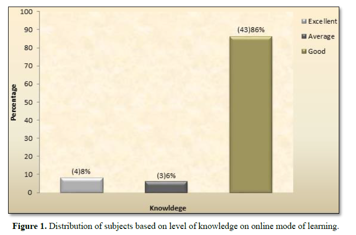 Figure 1 presents that majority (43)86% of the nursing students had good knowledge on online mode of learning and (4)8% excellent knowledge and (3)6% had average knowledge.
