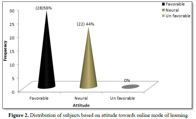 Figure 2 presents that (22) 44% and (28) 56% have neutral and favorable attitude towards online mode of learning respectively.