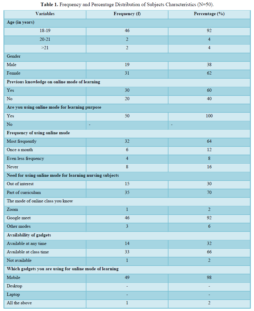 With regard to age in years, majority of (46) 92% belong to 18-19 years. Most of the (31) 62% were females. Majority i.e. (30) 60% had previous knowledge on online mode of learning. Data showed that majority of the subjects were using online mode for learning purpose i.e. (50)100% and 32(64%) had frequently been utilizing online mode for learning nursing subjects, most of participants’ i.e. (35) 70% had need for learning nursing subjects as part of curriculum. Majority i.e. (46)92% participants liked to use Google meet online mode. Students who participated in the study were (49)98% having mobile gadgets for online mode of learning and majority of the participant’s i.e. (33)66% had availability of gadgets at class time (Table 1).
