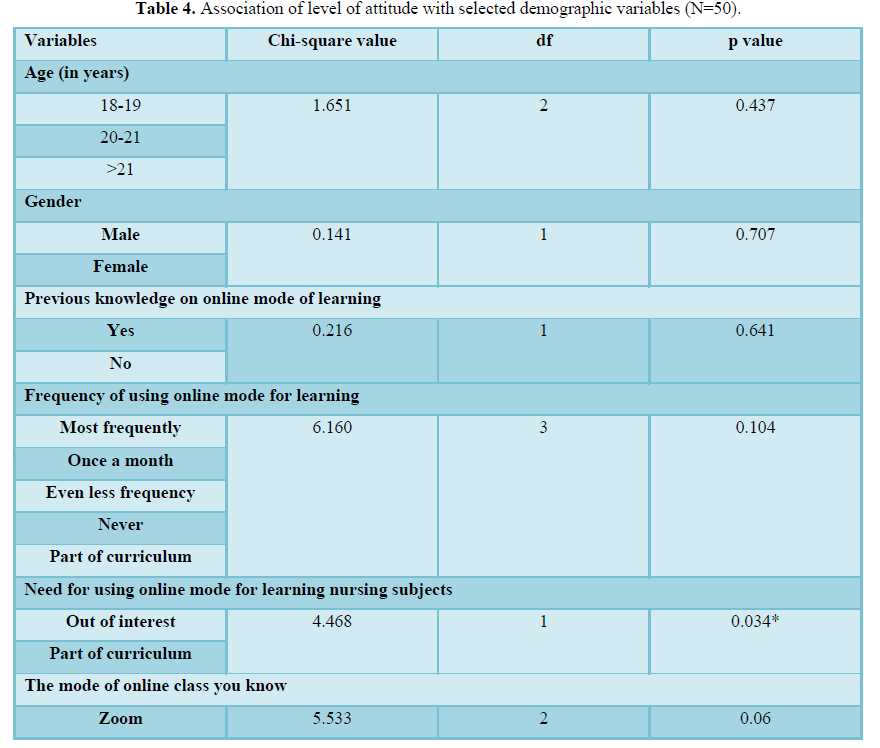 There was no statistical association between levels of attitude with demographic variables except need for online mode of learning (chi square=4.468) (Table 4).