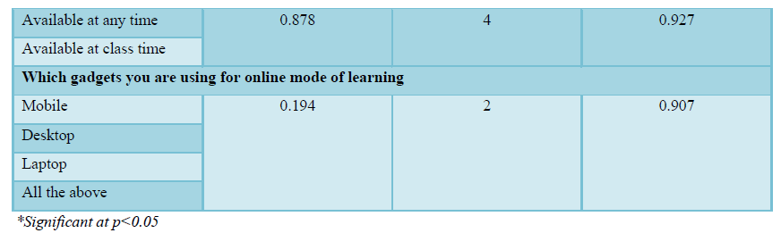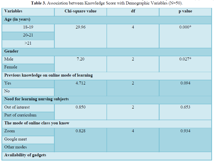 There was no statistical association between knowledge score with selected demographic variables such as, previous knowledge on online mode of learning, need for learning nursing subjects, the mode of online class you know, availability of gadgets and which gadgets you are using for online mode of learning except age in years (chi-square value=26.96) and gender (chi-square value=7.20) (Table 3).