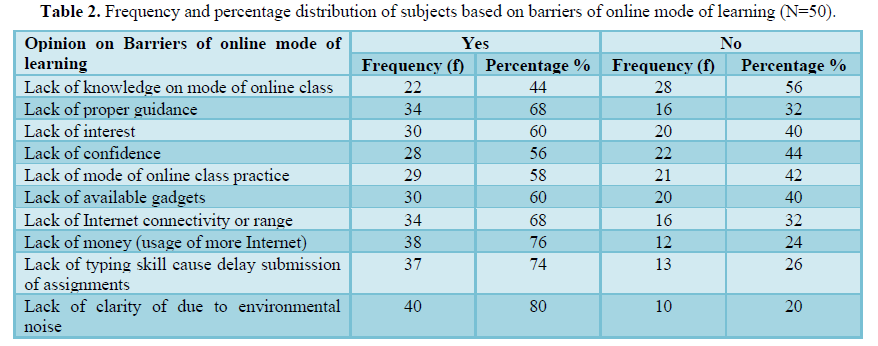 The data represented in Table 2 shows that, lack of knowledge on online mode of learning (22) 44% were stated yes. And (28) 56% were stated no. with regard to lack of proper guidance (34) 68% expressed yes and (16) 32% were expressed no. with regard to lack of interest majority (30) 60% were supported yes and only(20) 40% were expressed no. with regard to lack of confidence most of them (28) 56% were pointed yes and (22) 44% stated no. with regard to lack of mode of online class practice (29) 58% expressed yes and(21) 42% were no. with regard to lack of available gadgets(30) 60% and (20) 40% were stated yes and no respectively.