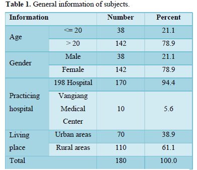 The study was conducted on 180 nursing students, in which male accounted for 21.1% and female was 78.9%. The majority of students practice at Hospital 198 (accounting for 94.4%), there is 5.6% students intern at Van Giang Medical Center. Students from urban areas 38.9%, from rural areas 61.1%. The research students’ age were 19-25 years old, students under 20 years old accounted for 78.9%, and over 20 years old was 21.1%. the mean age was 20.3±1.0 years old, (Table 1).