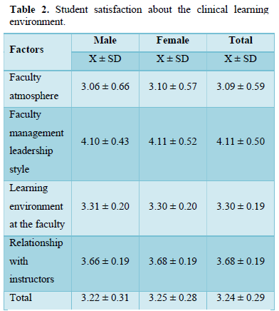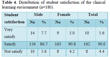 The results in the graph show that the very satisfied rate of students about the clinical learning environment is 5.6% (7.7% male students and 5.0% female students). There are 4.4% dissatisfied with the clinical learning environment (5.6% male students and 4.2% female students) (Table 4).