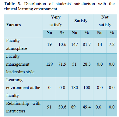 Students highly rated the satisfaction level of the clinical learning environment (3.24±0.29 points). In which, most students were satisfied with the faculty's leadership style (4.11±0.50 points) (Table 2).
