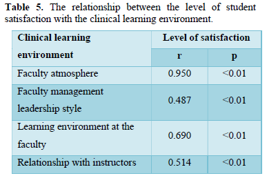 When assessing the correlation between the level of student satisfaction and the atmosphere at the internship faculty, the faculty's leadership style, the learning environment at the faculty, and the relationship with the instructors, the results show that there is a relationship between these factors. The positive correlation has statistically significant, in which the correlation between the atmosphere at the faculty and the satisfaction level of the students' clinical learning environment is the highest r-value (0,950) (Table 5).