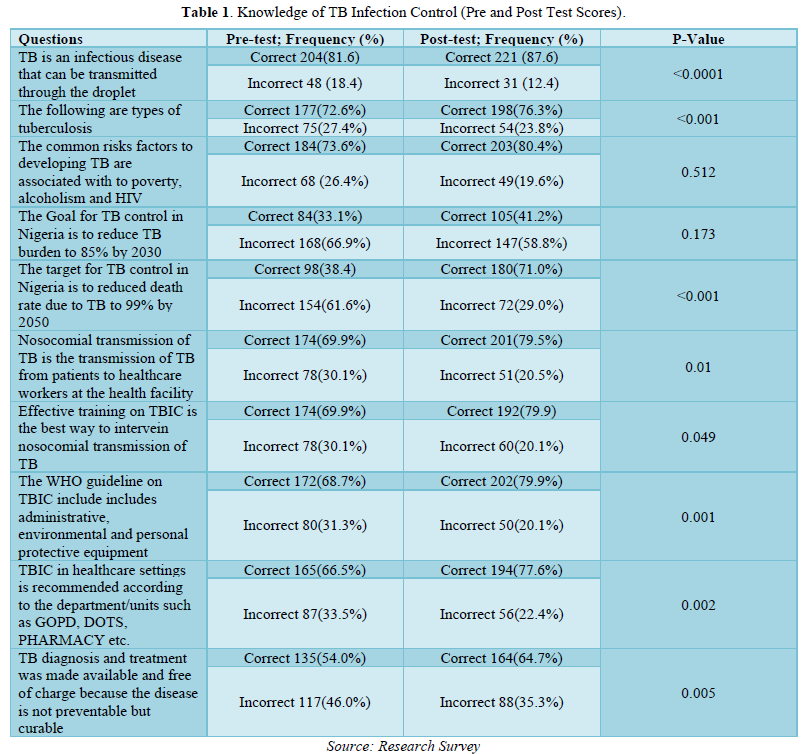 Of 252 total respondents 204(81.6%) answered rightly at the pre-test that TB is an infectious disease that can be transmitted through the droplet while 48(18.4%) answer incorrectly, On the same question 221(87.6%) of the respondents answered rightly at the post-test that TB is an infectious disease that can be transmitted through the droplet while 31(12.4%) answer incorrectly, this implies that the proportions of the respondents 221(87.6%) that answered rightly at the post-test is higher than the proportion of the respondents 204(81.6%) that answered correctly at the pre-test, this means that the training has increased the level of knowledge among the respondents that TB can be transmit via the droplet. It’s also observed that 177(72.6%) of the respondents answered rightly at the pre-test on the types of tuberculosis while 75(27.4%) answered incorrectly, on the same questions 198(76.3%) of the respondents answered rightly at the post-test on the types of TB while 54(23.8%) answered incorrectly, this implies that the proportions of the respondents198(76.3%) that answered rightly at the post-test is higher than the proportion of the respondents177(72.6%) that answered rightly at the pre-test, this means that the training has increased the level of knowledge among the participants on the types of tuberculosis infection. It’s also observed that 84(73.6%) of the participant answered correctly at the pre-test that the common risks factors to developing TB are associated with poverty, alcoholism and HIV while 68(26.4%) answered incorrectly, on the same questions 203(80.4%) answered correctly at post-test that the common risks factors to developing TB are associated with to poverty, alcoholism and HIV while 49(19.6%) answered incorrectly, this implies that the proportions of the respondents that answered rightly at the post-test 203(80.4%) is higher than the proportion of the respondents that answered rightly at the pre-test 84(73.6%), this means that the training has added value to the respondents. It’s also showed from the analysis of this result that 84(33.1%) of the respondents answered rightly at the pre-test that the Goal for TB control in Nigeria is to reduce TB burden to 85% by 2030 while 168(66.9%) answered incorrectly, on the same questions 105(41.2%) of the participant answered rightly at the post-test that the Goal for TB control in Nigeria is to reduce TB burden to 85% by 2030 while 147(58.8%) answered incorrectly, this implies that the proportion of the participants that answered rightly at the post-test 105(41.2%) is higher than the proportion of the participants that answered rightly at the pre-test 84(33.1%), this means that the training has increased the participants knowledge on the Goals of tuberculosis control in Nigeria. It’s also observed that 98(38.4) of the participants answered rightly at the pre-test that the target for TB control in Nigeria is to reduced death rate due to TB to 99% by 2050 while 154(61.6%) answered incorrectly, on the same questions 180(71.0%) of the participants answered correctly at the post-test that that the target for TB control in Nigeria is to reduced death rate due to TB to 99% by 2050 while 72(29.0%) answered incorrectly, this implies that the proportions of the of the participants that answered rightly at the post-test 180(71.0%) is higher than the proportions of the participants that answered rightly at the pre-test 98(38.4), this is means that the training has increased the level of knowledge of the participants on the targets of TB control in Nigeria. It’s also observed that 174(69.9%) of the participants answered rightly at the pre-test that Nosocomial transmission of TB is the transmission of TB from patients to healthcare workers at the health facility while 78(30.1%) answered incorrectly, on the same questions, 201(79.5%) of the respondents answered correctly at the post-test that Nosocomial transmission of TB is the transmission of TB from patients to healthcare workers at the health facility while 51(20.5%) answered incorrectly, this implies that the proportions of the respondents 201(79.5%) that answered rightly at the post-test is higher than the proportions of the participants 174(69.9%) that answered rightly at the pre-test, this means that the training has increased the level of knowledge among the respondent that nosocomial transmission of TB is the transmission of TB from patients to health care workers in health facilities. It’s also observed that 174(69.9%) of the participants answered rightly at the pre-test that Effective training on TBIC is the best way to intervein nosocomial transmission of TB while 78(30.1%) answered incorrectly, on the same questions 192(79.9) of participants answered correctly at the post-test that Effective training on TBIC is the best way to intervein nosocomial transmission of TB while 60(20.1%) answered incorrectly, this implies that the proportions of the respondents192(79.9) that answered rightly at the post-test is higher than the proportions of the respondents 174(69.9%) that answered correctly at the pre-test, this means that the training has added value to the participants that effectives training on TBIC is the best way to intervened the transmission of TB among HCWs. Its showed from the analysis of this study that 172(68.7%) of the participants answered rightly at the pre-test that the WHO guideline on TBIC include includes administrative, environmental and personal protective equipment while 80(31.3%) answered incorrectly, on the same questions 202(79.9%) of the respondents answered correctly at the post-test that The WHO guideline on TBIC include includes administrative, environmental and personal protective equipment while 50(20.1%) answered incorrectly. This implies that the proportions of the participants 202(79.9%) that answered rightly at the post-test is higher than the proportions of the respondents172(68.7%) that answered correctly at the pre-test, this means that t