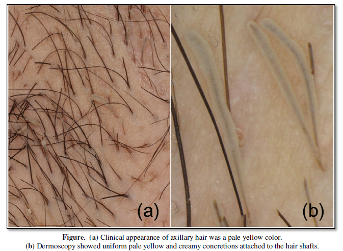 was identified as reported previously [2]. We diagnosed the lesions as trichomycosis axillaris. It