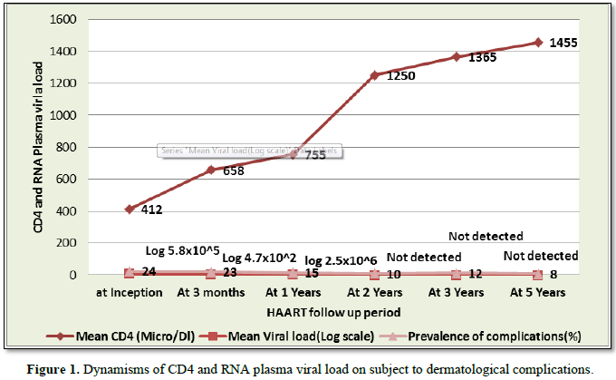 The dynamism of CD4 count and RNA plasma viral load presented in the Figure 1, the results revealed that, the mechanism of virus becomes debilating in nature, an early stage, the virions showed geometrically progressed in the human system and it will reduce the immunity of the PLHIVs, the resulted reduction of immunity has shown drastic reduction of the immunity among the infected children as well as adult population. Since it will exhibit clinical and dermatological complications. Figure 1 clearly depicted that, an early stage of infection or at the time of inception of HAART, CD4 counts were seen low rate, the mean CD4 count was 412 µ/dl, CD4 follow up at 3 months,12 months and 24 months, CD4 count is drastically increased with fewer RNA plasma viral load expression. At the time of inception of HAART, the prevalence of dermatological complications was seen numerically doubling with high plasma viral load. Table 2 describes the various dermatological complications with respect to base line CD4 count and mean CD4 count at the end of the study period. The present study documented that, the various prevalence of skin lesions was found in the age group 20-55 years of HIV infected patient, the scabies is the most communist manifestations in the study population it was expressed (30.0%) with mean CD4 count was 243 µ/dL followed by Hz (16.67%); CD4 count was 247 µ/dl, Kaposi’s sarcoma (1.33%); drug eruptions (8.0%); papular pruritic eruptions (4.67%); nail pigmentations (8.0%) and fungal infections-candida (5.33 %); lichenoid eruption (3.33%) and herpes simplex only one case was seen (0.67%).