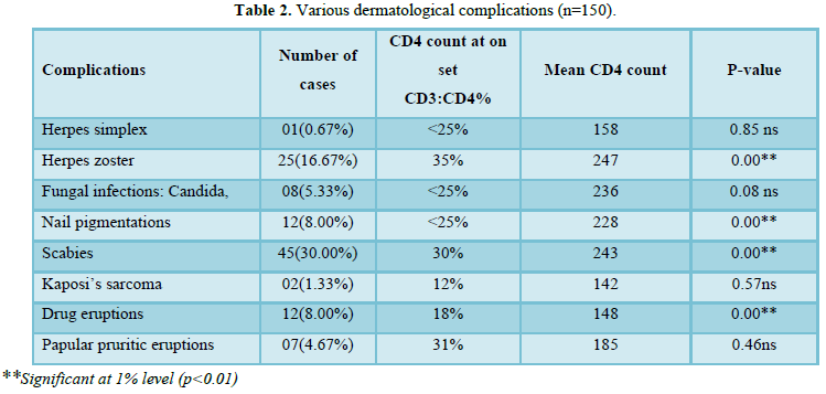 An observational study was conducted at Department of Dermatology and Venerology, KIMS Bengaluru during the period 2014-2015. PLHIVs who are received on ‘HAART’ with the age group 20-55 years were considered for the study population. The following inclusion and exclusion criteria were taken in to consideration. Inclusion; the patients with reliable dermatological complications age group 20-55years, family history and other associated parameters were included. Exclusion; patients who are not regular follow up of HAART, treatment, lost to follow up, ART treatment received from outside the country and congenital anomalies were excluded from the study population. The demographic profile, patient history and treatment follow-up records were recorded in a separate master chart by using pretested questionnaires. The final outcomes like morbidity, mortality, complications were correlated between age and sex matched frequency respectively. Sample size determination derived based on the following formula n=p/q x 1/α^2 , where, P=the treatment success and q=treatment failure has been fixed 0.20 and 0.80 respectively with desired level of significance 5% level (α=0.05) n=0.20/0.80 x 1/〖0.05 〗^2 = n=150 patients. The collected data was analysed by using SPSS -16.50 software version, the following statistical methods were used to test the hypothetical results. Univariate analysis, receiver operating characteristic curve and logistic regression analysis.