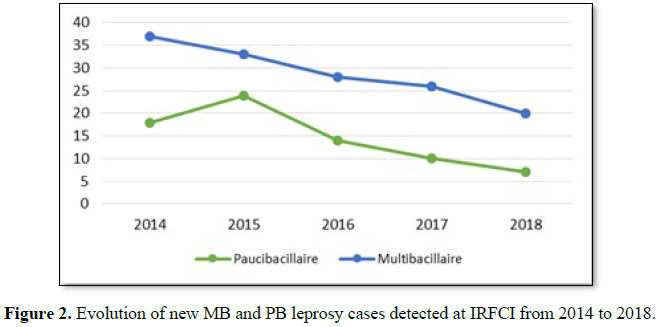 At the end of our study conducted at the IRFCI in Adzopé during the last five years, we can say that the leprosy situation remains worrying. The high level of multibacillary forms suggests continuing PCT leprosy and increasing surveillance at the national level to permanently eliminate this infection. Awareness needs to be created and raised not only for health staff and practitioners but also for the population in order to achieve early detection of the disease and the elimination of pediatric leprosy cases. It would also be necessary to push the reflection by the installation of a system for controling, monitoring and warning of leprosy.