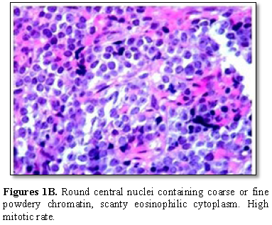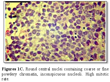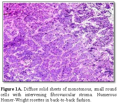 Ewing sarcoma/PNET is the second most common sarcoma among children/young adults and PNET occurs in a broader age range than the extraskeletal counterpart [1]. PNET occurs outside the brain, spinal cord and sympathetic nervous system and is mostly seen in the deep soft tissue of the extremities/paravertebral areas. The primary visceral PNETs are extremely rare [4]. However, PNET is considered as a more differentiated form of the ES/PNET family and PNET with less/infrequent rosette formation overlaps with ES and a malignant small round cell tumor of the thoraco-pulmonary region. All of the tumors share the same and unique chromosomal translocation (t[11; 22][q24;q12]) and expression of p30/32 cell surface glycoprotein antigen. The present case showed Homer-Wright rosette formation favoring PNET over extraskeletal ES [1-4].