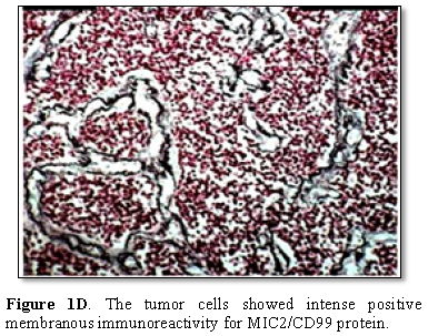 The MIC2 gene on the short arms of the X and Y chromosomes encodes the cell surface glycoprotein p30/32. Immunohistochemical staining for MIC2/CD99 is highly sensitive for the diagnosis of ES/PNET, but other small round cell tumors, such as T-cell lymphoblastic lymphoma, small cell osteosarcoma, rhabdomyosarcoma, desmoplastic small round cell tumor, small cell carcinoma and Merkel cell carcinoma may also show positivity for MIC2/CD99 [1]. Therefore, the MIC2/CD99 marker should only be used as part of an immunohistochemical panel because of lack of the specificity. In this case the possibility of other small round cell tumors such as lymphoma, rhabdomyosarcoma and melanoma were excluded by negative immunoreactivity for leukocyte common antigen, desmin, epithelial membrane antigen and S100, respectively. The present patient is an example of grave outcome of untreated PNET. The clinical importance to differentiate PNET from ES has not yet been determined because of the limited number of cases and short follow-up periods.