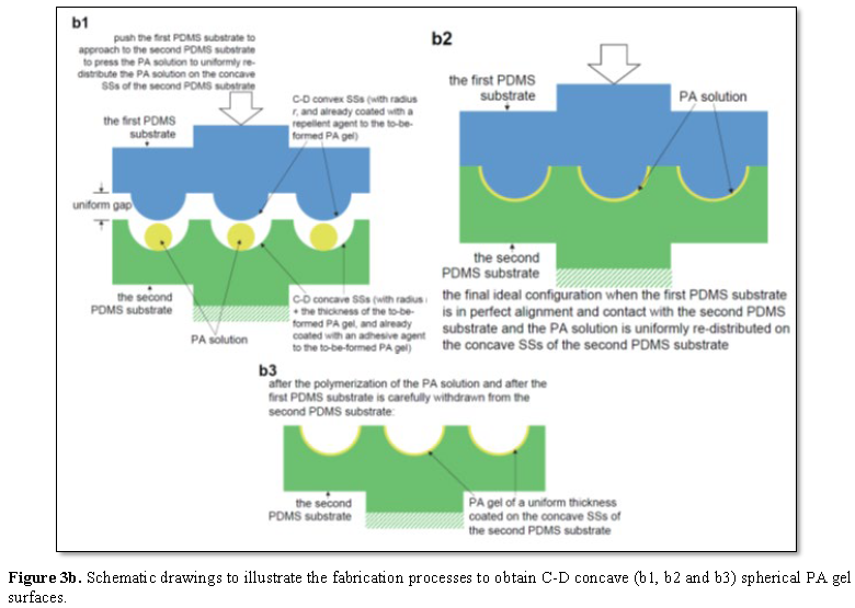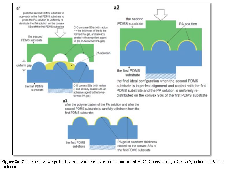With respect to an exact C‐D convex SS of a desired radius, the shape accuracy of these formed convex SSs of the PA gel will be highly dependent on the precision of the alignment between the first and second PDMS substrates when the second PDMS substrate presses the PA solution to re‐distribute the PA solution on the convex SSs of the first PDMS substrate, and highly dependent on the thickness of the remaining PA solution between the contacting flat parts of the first and second PDMS substrates. A complete squeezing‐out of the PA solution between the flat parts of the first and second PDMS substrates is impossible, but a lot of practice may help establish a strategy to minimize the thickness of the remaining PA solution between these contacting flat parts, and to uniformly re‐distribute the PA solution on the convex SSs of the first PDMS substrate. The high‐precision alignment between the first and second PDMS substrates will ensure that, the gap between the C‐D convex SSs of the first PDMS substrate and the corresponding C‐D concave SSs of the second PDMS substrate is uniform, and this uniform gap will ensure the thickness of the PA gel formed in the gap and coated on top of the convex SSs of the first PDMS substrate is uniform. The great success of the high‐precision alignment between a mask and a silicon wafer in the widely‐used traditional micro‐patterning technology photolithography [38,39] shows that the high‐precision alignment between the first and second PDMS substrates required here will be achievable, and then the high shape accuracy of the above‐formed convex spherical PA gel surfaces of the first PDMS substrate may also be achievable.
