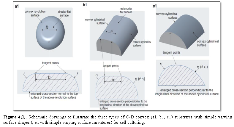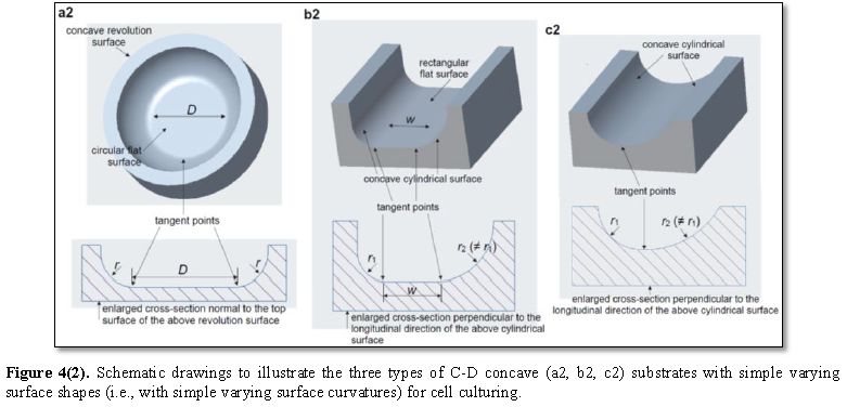 C‐D convex and concave SSs have uniform surface shapes, i.e., the through‐center normal cross‐sections of these SSs are circular and have single invariant curvatures, equal to the inverses of the radii of these SSs, along their circumferences. The following three types of C‐D convex (Figure 4a1-4c1) and concave (Figures 4a2-4c2) substrates may be designed and fabricated to present simple varying surface shapes for cell culturing, i.e., the normal cross‐section of the surface of each of these substrates has a varying curvature or has two or more curvatures. (1). Substrates have revolution surfaces whose through‐center normal cross‐sections consist of a segment of horizontal straight line (D) and two symmetric circular arcs with the desired radius (r) tangent to the two ends of this segment of straight line (Figure 4a). The through‐center normal cross‐section of the surface of each of these substrates has two curvatures with one being the zero curvature of the segment of horizontal straight line and the other being the nonzero curvature of each of the two symmetric circular arcs in this normal cross‐section. This type of shape‐varying substrates provides smooth surfaces having the shape‐variation settings of from a circular flat surface to a curved surface with a defined uniform shape and vice versa. (2) Substrates have cylindrical surfaces whose normal cross‐sections (which are perpendicular to the longitudinal directions of these cylindrical surfaces) consist of a segment of horizontal straight line (w) and two circular arcs with the desired different radii (r1 and r2) tangent to the two ends of this segment of straight line (Figure 4b). The normal cross‐section of the surface of each of these substrates has three curvatures with one being the zero curvature of the segment of horizontal straight line sandwiched between the other two being the nonzero curvatures of the two circular arcs attached at the two ends of this segment of straight line in this normal cross‐section. This type of shape‐varying substrates provides smooth surfaces having the shape‐variation settings of from a rectangular flat surface to two curved surfaces with defined different uniform shapes at the two longitudinal sides of this rectangular flat surface and vice versa. (3) Substrates have cylindrical surfaces whose normal cross‐sections (which are again perpendicular to the longitudinal directions of these cylindrical surfaces) consist of two smoothly‐connected (i.e., tangent) circular arcs with the desired different radii (r1 and r2) (Figure 4c). The normal cross‐section of the surface of each of these substrates has two different nonzero curvatures which are the curvatures of the two circular arcs in this normal cross‐section. This type of shape‐varying substrates provides smooth surfaces having the shape‐variation settings of from a curved surface with a defined uniform shape to another curved surface with a defined different uniform shape. The time‐lapse curvature‐dependent spreading and migration responses of the stem cells cultured on these three types of shape‐varying substrates may be investigated. The results of these experiments will reveal the stem cells’ abilities to recognize and to respond to surface curvatures and the stem cells’ abilities to differentiate and to respond to curvature variations or curvature differences. Since surface curvatures create height differences between different locations on curved surfaces, together with the results of the experiments proposed in the above part for the stem cells cultured on convex and concave SSs, the results of the experiments proposed here will also reveal the stem cells’ abilities to differentiate and to respond to the height differences on the surface of a substrate.