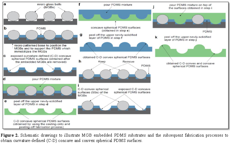 Increasing evidences have shown that mechanical factors have profound influences on cellular biochemical and biological behaviors, but the relevant studies in cell mechanobiology are far from being systematic or well‐documented. Substrate geometries, which belong to mechanical factors, have been shown to influence and induce stem cell differentiation. These substrate geometries mainly include the planar geometrically defined micro‐patterns [1‐6] and the non‐ planar nanotopographies [7‐11]. Motivated by the necessity to study the behavioral responses of cells growing on curved surfaces [12], a few methods, including sucking a thin polydimethylsiloxane (PDMS) membrane through a shadow mask [13], thermal reflow of photoresist [14] and stereolithography and the after slowly‐shrinking [15], have been developed to fabricate convex and concave microstructures to culture cells. However, these methods cannot precisely control the geometrical shapes of the surfaces of the fabricated convex and concave microstructures and the shapes of the surfaces of these fabricated convex and concave microstructures are not necessarily spherical and the curvatures of the surfaces of these fabricated microstructures normally cannot be precisely known or defined. It is also very problematic to use these methods to fabricate convex and concave microstructures at larger or millimeter scales for cellular studies.