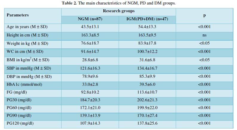 The average values ± Standard Deviation are presented in this article. The statistical significance of the differences between the average values was determined by the Student's T-test. Chi-square tests were applied to compare categorical variables [18]. A correlation analysis of the relationship between PG60 and HbA1C, FG, PG120 was performed [19]. Confidence interval (CI) 95% was determined for correlation coefficient [20].
