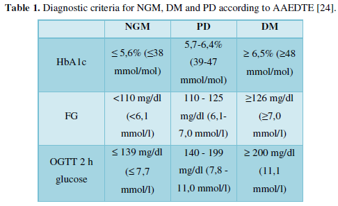 Fasting glucose (FG), glycated hemoglobin (HbA1C) and 2-h plasma glucose value during 75-g oral glucose tolerance test (OGTT) are used for DM diagnostics. The same tests are applied also for PD detection [1].
